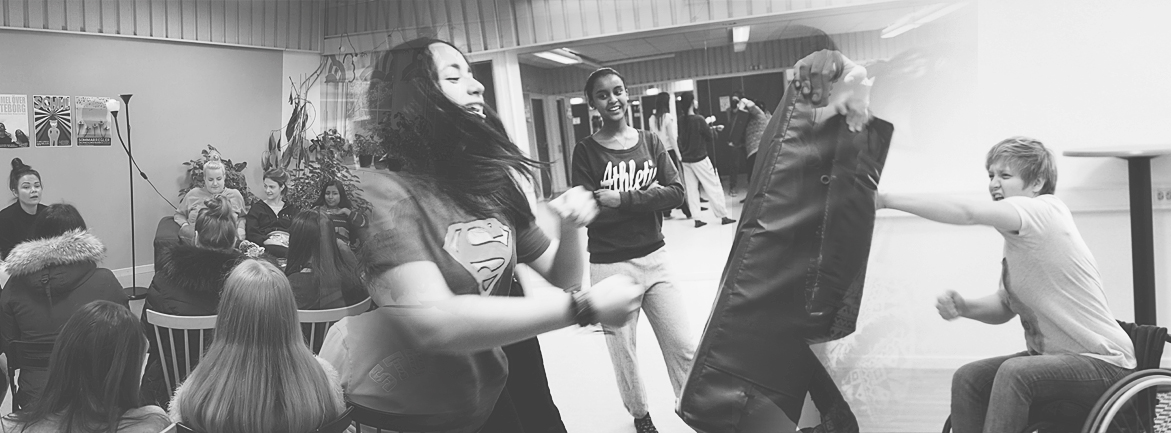 Vi anordnar kurser, pass och föreläsningar i feministiskt självförsvar.